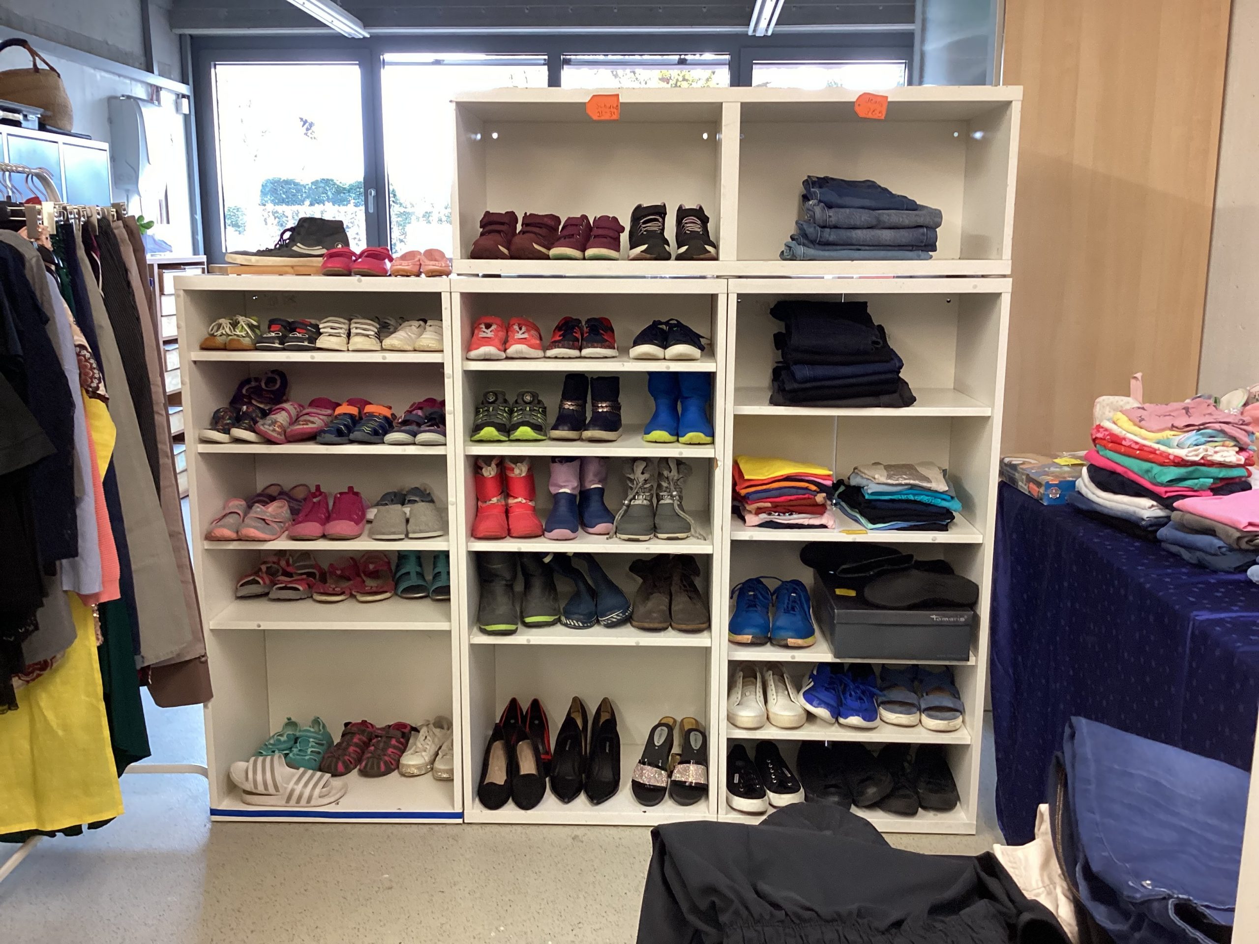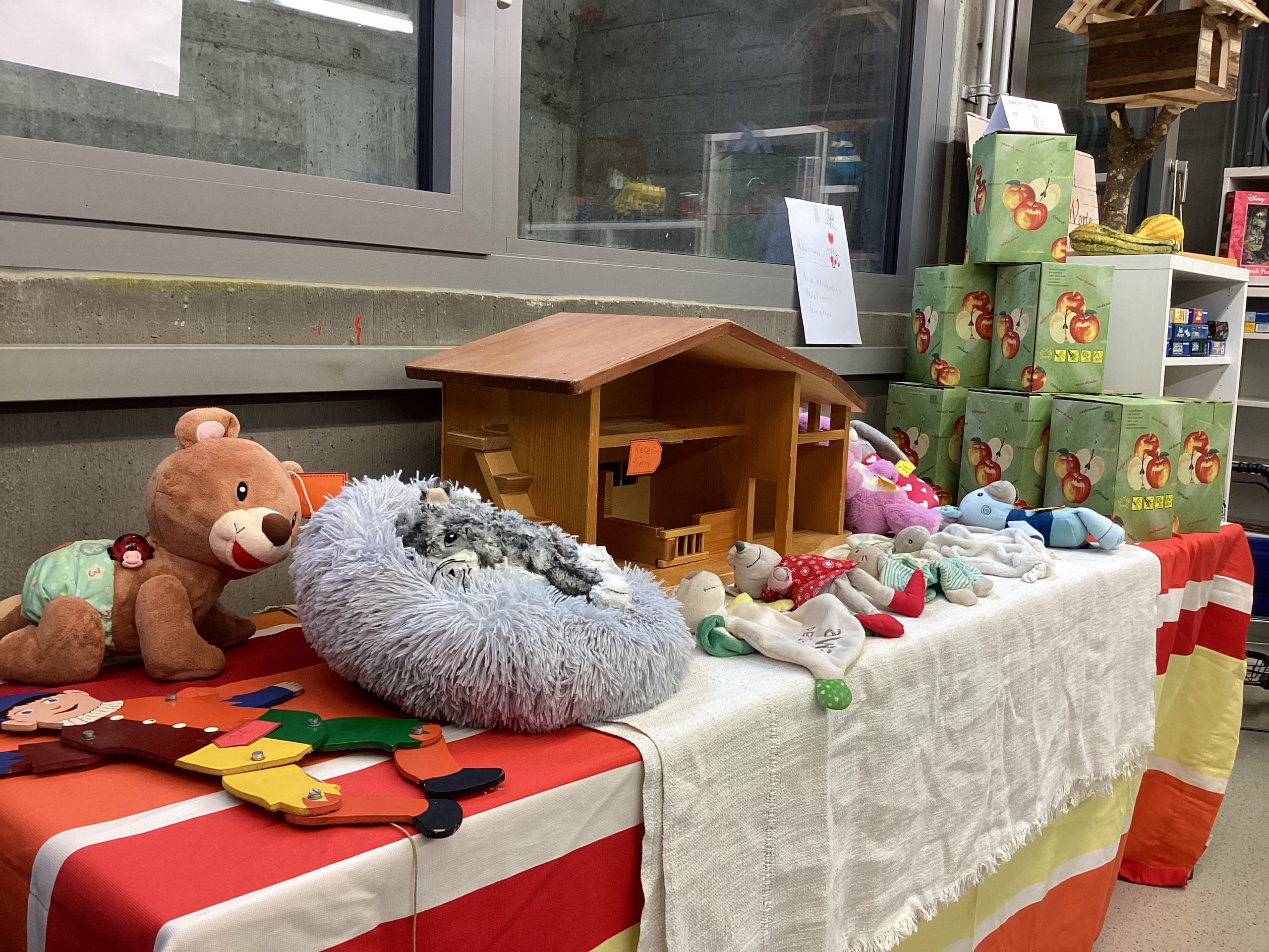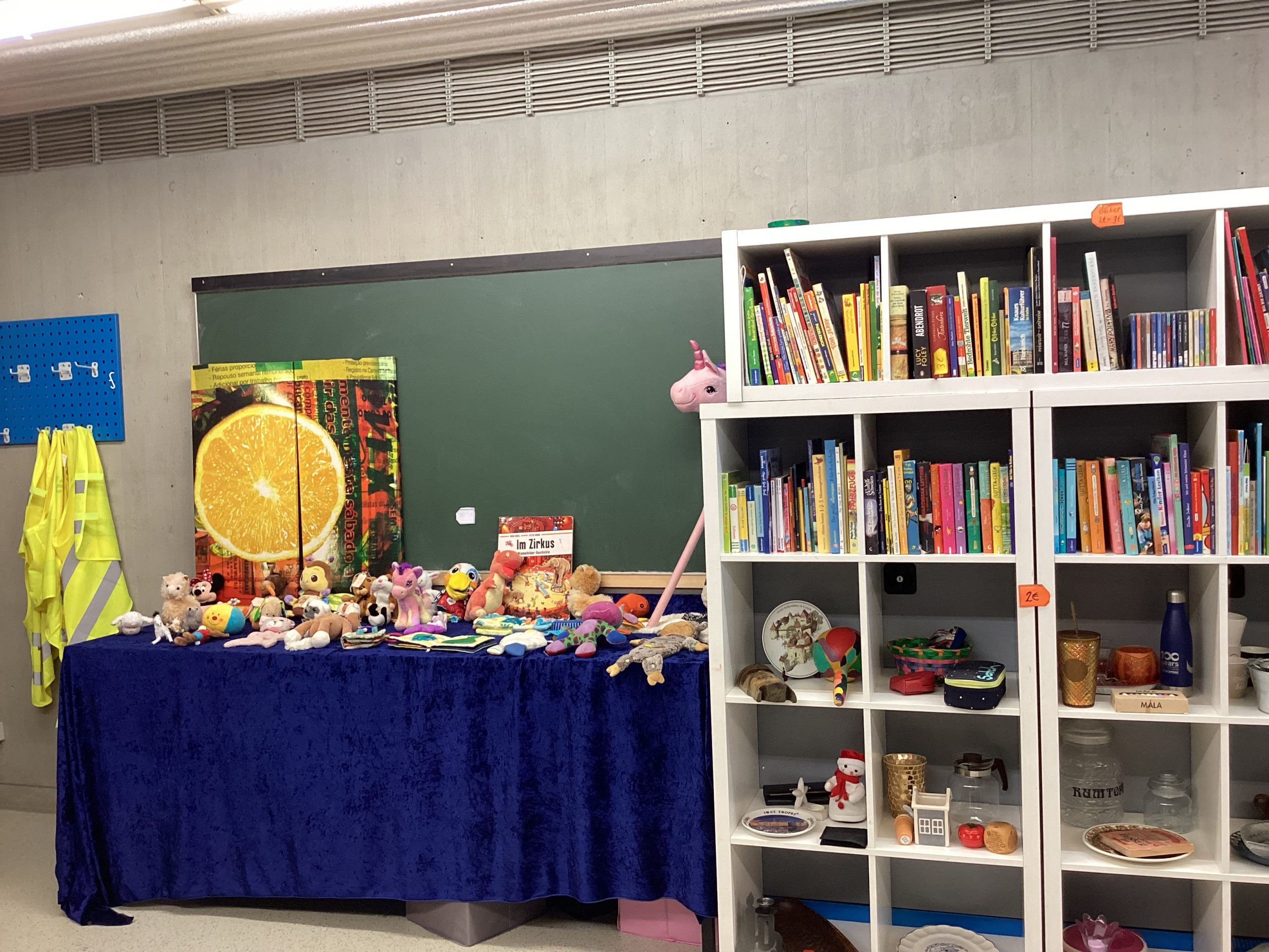Zum Einkaufen lockte besonders der Second-Hand-Laden der Kollegstufe im Untergeschoss. Viele gut erhaltene Bücher, Spiele, Klamotten und schöne Dinge gab es dort zu finden. Selbstgemachte Dinge gab es von der Hauptstufe mit Milchtüten-Kräutertöpfchen, Vogelfuttertassen und Windlichtern. Auf dem unteren Pausenhof gab es eine Spielstraße und einen Popcornstand der Kollegstufe.