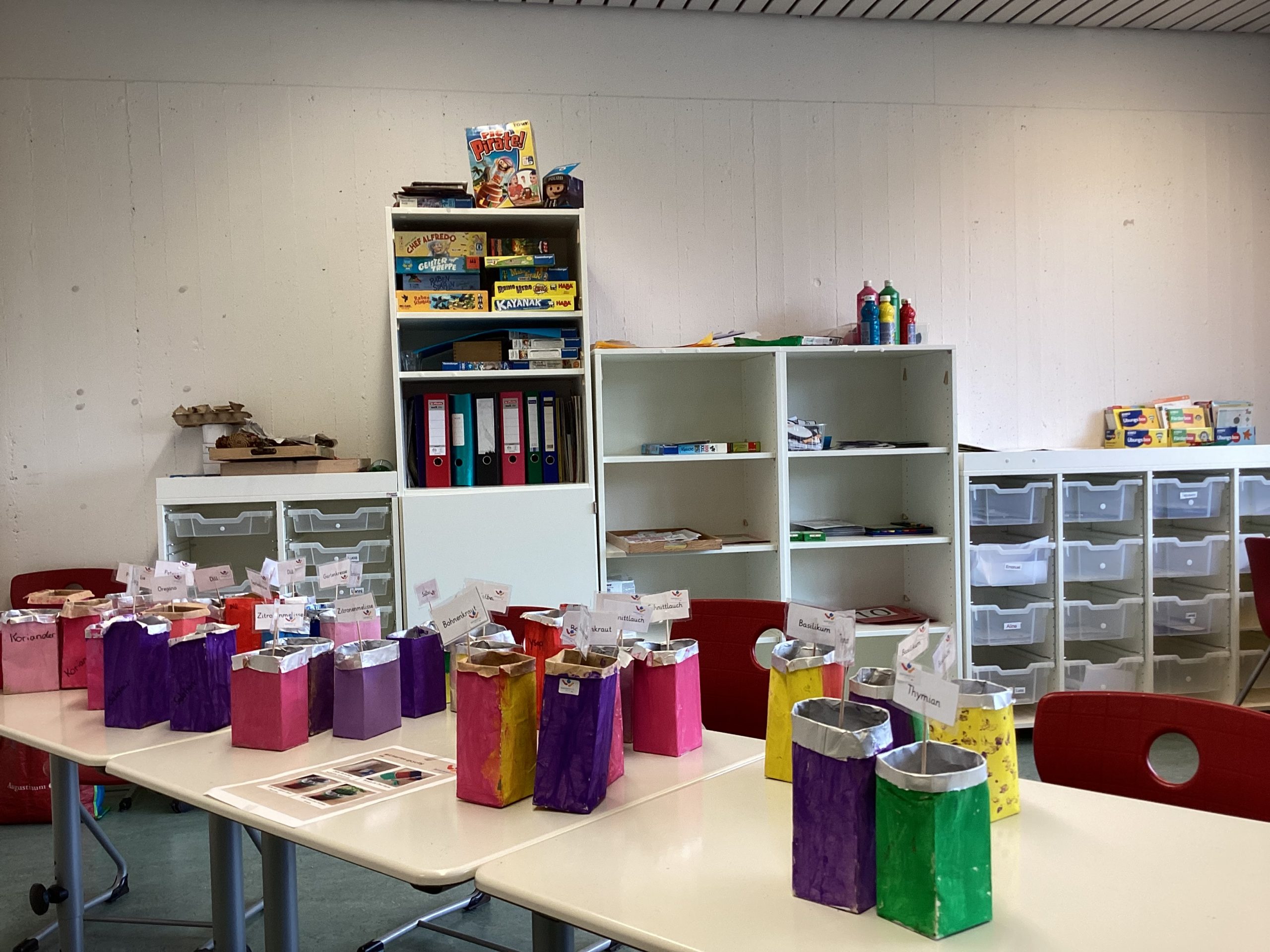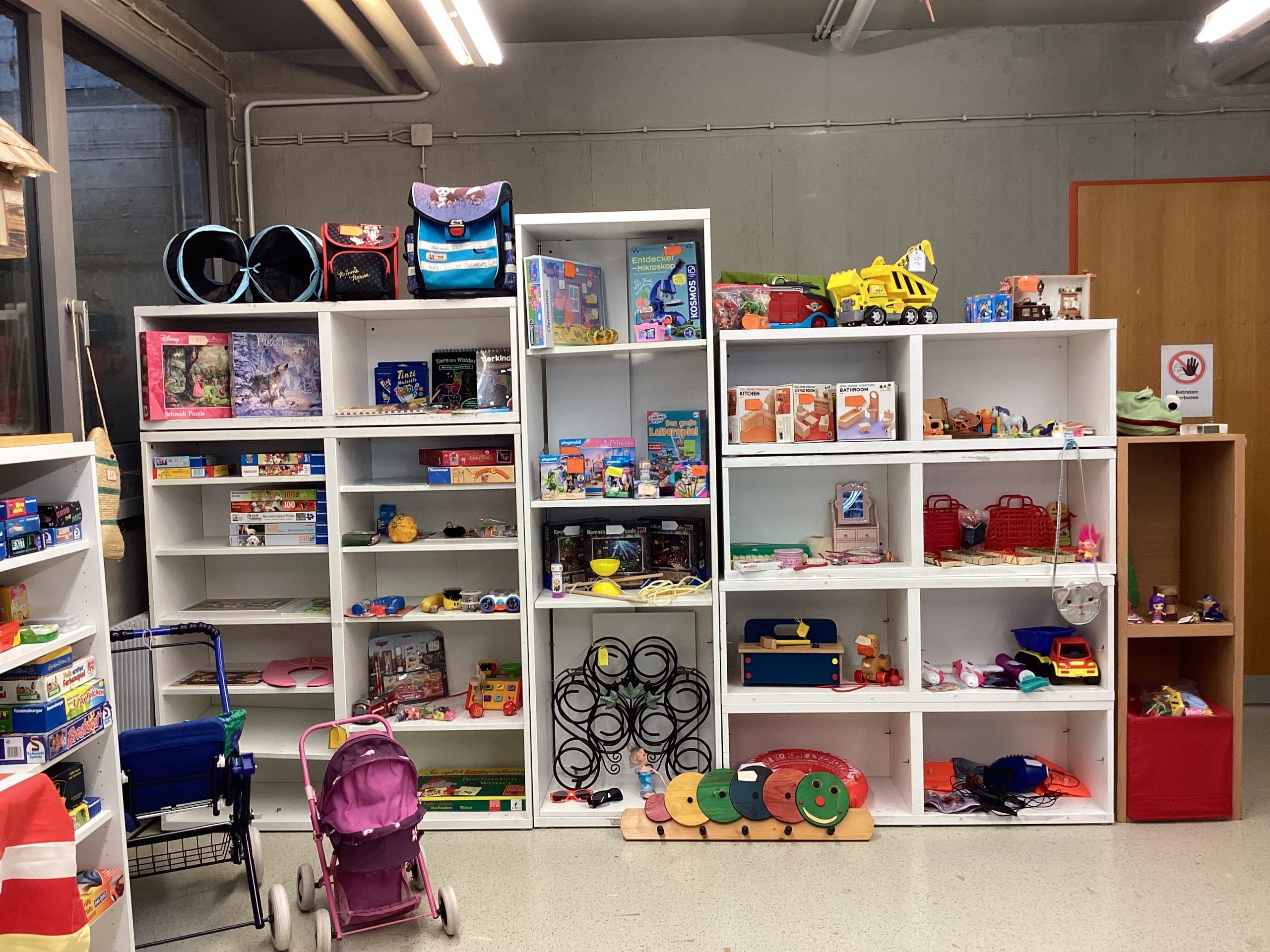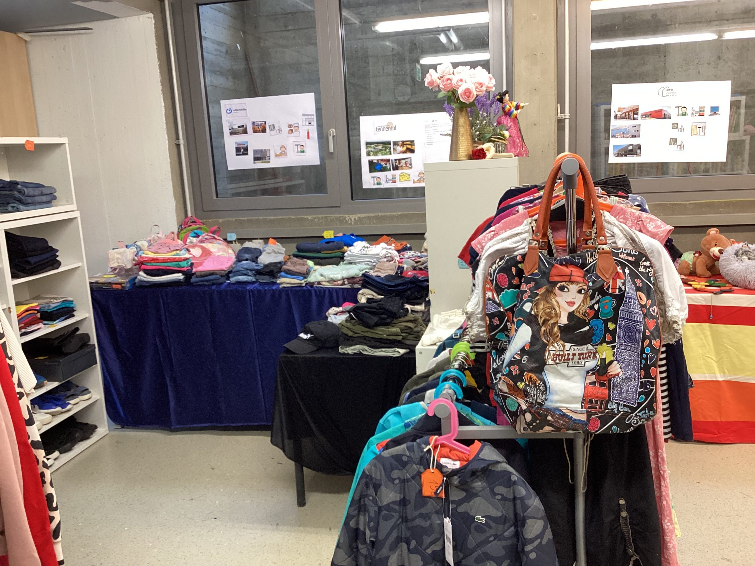 Zum Einkaufen lockte besonders der Second-Hand-Laden der Kollegstufe im Untergeschoss. Viele gut erhaltene Bücher, Spiele, Klamotten und schöne Dinge gab es dort zu finden. Selbstgemachte Dinge gab es von der Hauptstufe mit Milchtüten-Kräutertöpfchen, Vogelfuttertassen und Windlichtern. Auf dem unteren Pausenhof gab es eine Spielstraße und einen Popcornstand der Kollegstufe.